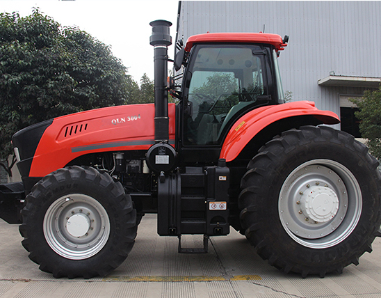 Chalion 300HP farm tractor with Shangchai six cylinder engine, turbocharger, inter-cooling, 12 hours rated power: 221kw, fully enclosed drive cabin, air heater, air conditioner, self developed Transmission, 16F+4R gears, synchronizer shift, unit frame chassis, driving system with modularized structure, famous international brand front axle,construction machinery rear axle, caliper disc brake, power output shaft rotation speed: 540/1000 r/min, fully hydraulic front wheel steering, three groups of single/dual action hydraulic output, plough depth control method by position, floating control, and suspension mechanism of rear-mounted Category III.